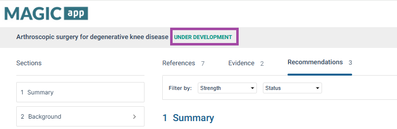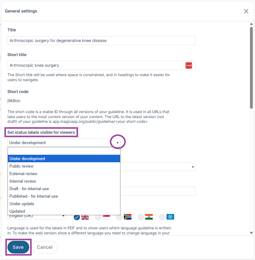 Status labels allow you to communicate the status of your guideline to viewers. They can be used to indicate the guideline status to both readers of public guidelines, and to authors and reviewers of guidelines in development that aren’t public. The status labels available are: